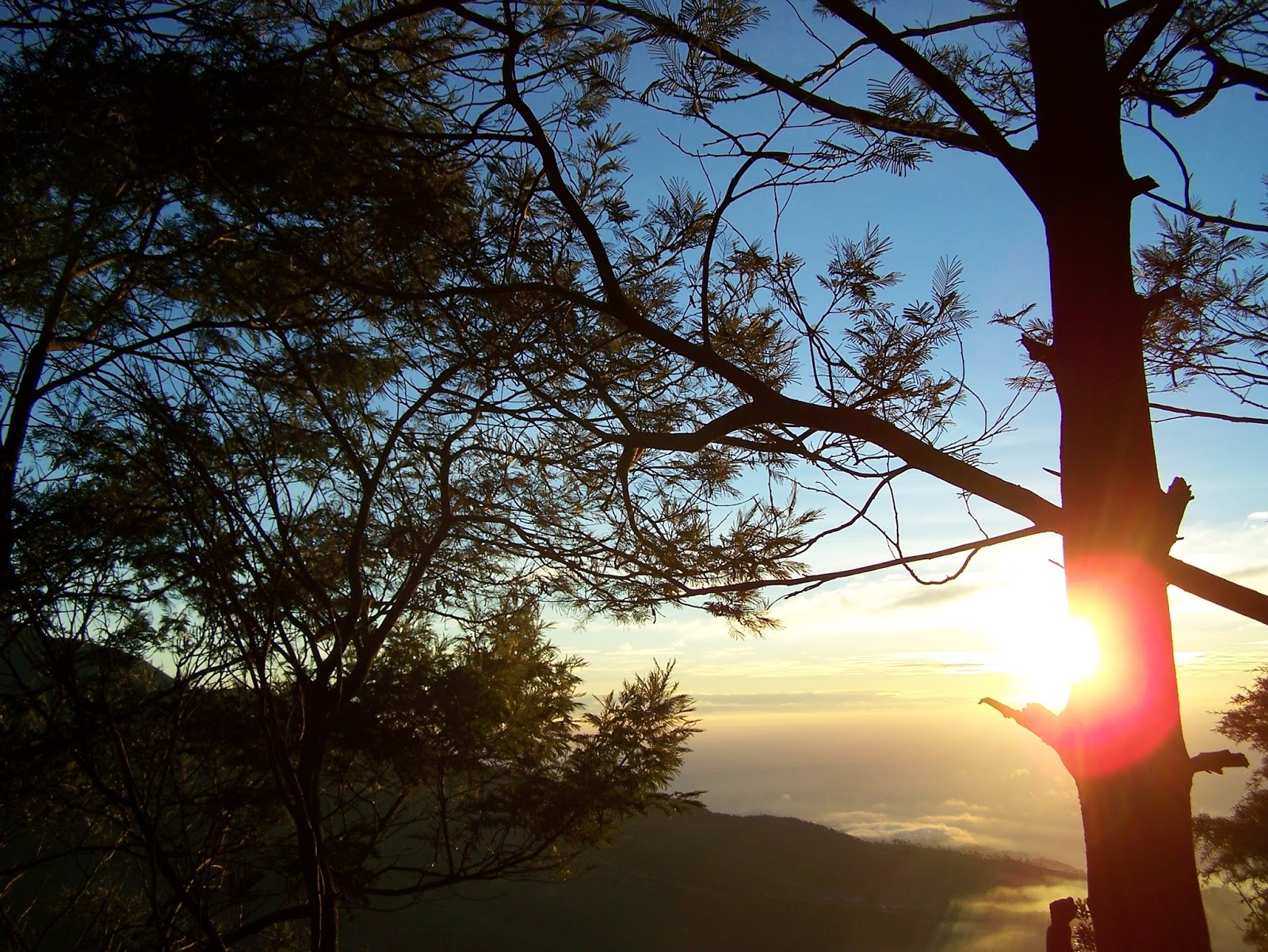 Semburat kuning jingga mulai menyeruak kabut pagi di ujung cakrawala. Perlahan sederetan gunung mulai jelas bentuknya di kejauhan, puncak Sindoro berdiri gagah paling depan. Kumpulan awan putih menghiasi sela antara gunung-gunung bagaikan permadani. Wuuiiiiiihhh… bener-bener negeri di atas awan deh….