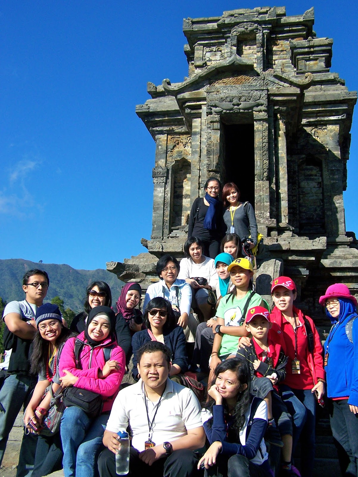 Abis makan siang, kami bergerak ke kawasan Candi Arjuna. Siang itu cuaca sangat bersahabat. Langit biru dihiasi gumpalan-gumpalan awan putih. Udara yang sejuk walaupun matahari tersenyum dengan hangatnya (klo ga mo dibilang panas sih :D). Karena suasana di sekitar kawasan Candi Arjuna sangat rame, dan kami pun datengnya udah siang, supaya tetap bisa ngikutin itinerary yang udah dibuat, jadi gw dan teman-teman ga bisa berlama-lama di situ. Beres poto-poto, keliling-keliling, Zee ngajak nerusin ngubek-ngubeknya ke Telaga Warna. Tapi teuteup…. sebelum kabur, poto-poto duluuuuuuu……