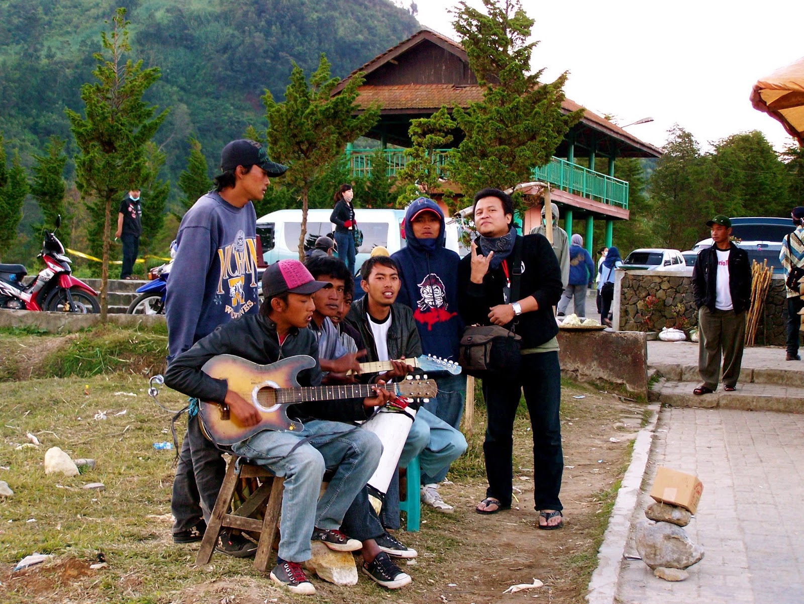 Bau belerang terasa banget lho di pinggir kawahnya. Asapnya juga terlihat di mana-mana. Kudu wajib harus pinter-pinter liat arah angin, jadi bisa menghindari uap belerang yang ngepul dari arah kawah. Dan u know, di pinggir kawah pun, itu rombongan narsis teuteup rusuh dan sok bergaya ala boyband 😀 Penasaran kan, mo liat aksi boybandfrom Dieng??? Let’s check it out!